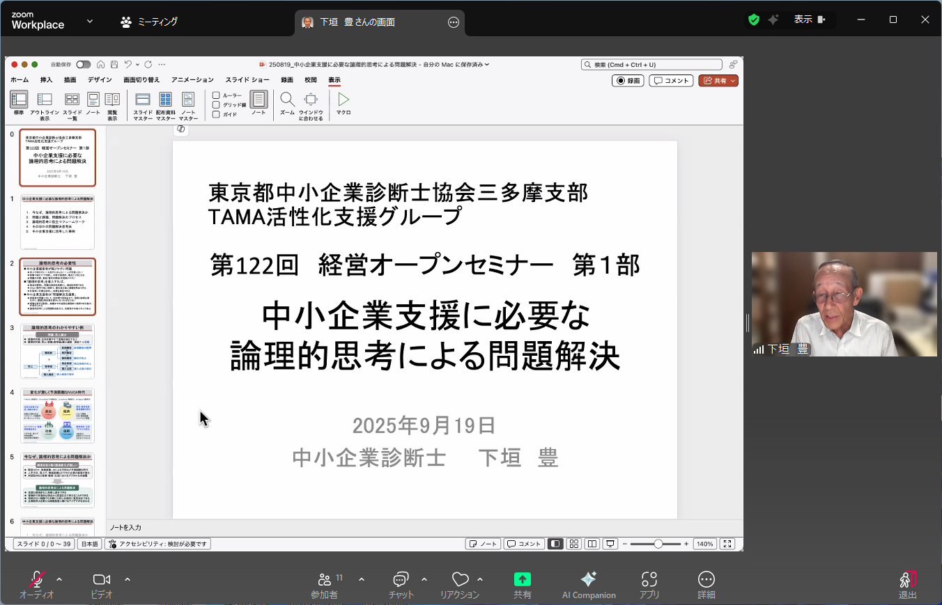 三多摩支部「TAMA活性化支援グループ」は、2025年8月19日(火)に第122回経営オープンセミナーとして、1部「中小企業支援に必要な論理的思考による問題解決」、2部「⽣成AI活⽤に向けたデータマネジメント」をZoomによるオンラインで開催し、会員を含め11名が参加しました。
