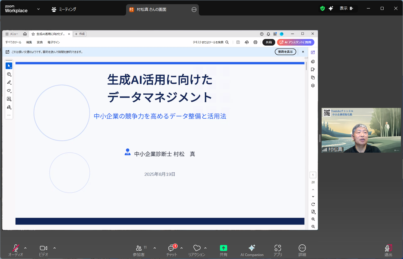 セミナー2部では村松真会員より、中小企業のAI活用とデータの整備の重要性について説明されました。ご自身の業務経験を織り交ぜながら、国際比較や大企業との比較を用いて、中小企業におけるAI活用の重要性を踏まえ、組織的に活用されていない現状、情報のサイロ化、データ定義や保存方法の不統一、知識の形式知化の不足など日本企業の構造的課題を挙げられました。AI-Readyなデータ整備の具体策として、ファイルの命名ルール策定、分類ルールの整備、全社共有文化の醸成などを提案し、活用事例として、社内FAQの自動化、会議録要約、NotebookLMの活用などを紹介しました。AIを最大限活かすには日々の地道なデータ整備が不可欠であり、最後に「質の高いデータの蓄積が企業の未来を作る」と締めくくられました。