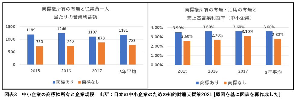 図表2は、ブランドの構築・維持に取り組む企業が活用しているブランド要素を示したものである。「企業のロゴやマーク」「商品・サービスの固有名称」と回答した企業の割合が高く、商標がブランド形成に大きく貢献していることがうかがえる。さらに、2021年に特許庁が作成した「日本の中小企業のための知的財産支援策」によれば(図表3参照)、商標権を保有している企業とそうでない企業の間では、営業利益額に明確な差が見られる。このことからも、商標が中小企業の経営成果に与える影響の大きさが示されている。