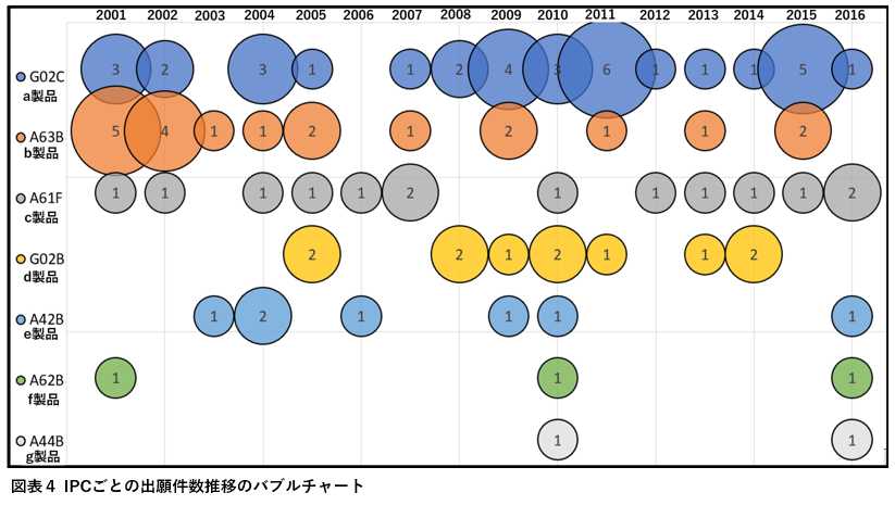 新たな市場に参入する場合は、図表4のような、関連技術分野におけるIPC(国際特許分類)の出願状況をパテントマップなどで確認することが推奨される。IPCは、技術の分類を示す。したがって、IPCごとに出願件数を示すことで、どの技術に出願が活発にされているかがわかる。図表に示されるように競合他社の出願が集中している場合、その分野への参入は困難である可能性が高い。同様に、既存事業を展開する中でも、パテントマップを作成して競合他社の研究開発の状況を調査することは有効である。IPCを詳細レベルで分析することで、競合の技術開発の方向性を把握し、それに対応する戦略を構築することが可能となる。