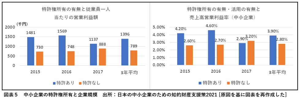 2021年に特許庁が作成した「日本の中小企業のための知的財産支援策」によれば、図表5のとおり、特許権を保有する企業とそうでない企業の間では、営業利益額に明確な差が見られる。このことからも、知的財産戦略が中小企業の経営に与える影響は非常に大きいといえる。