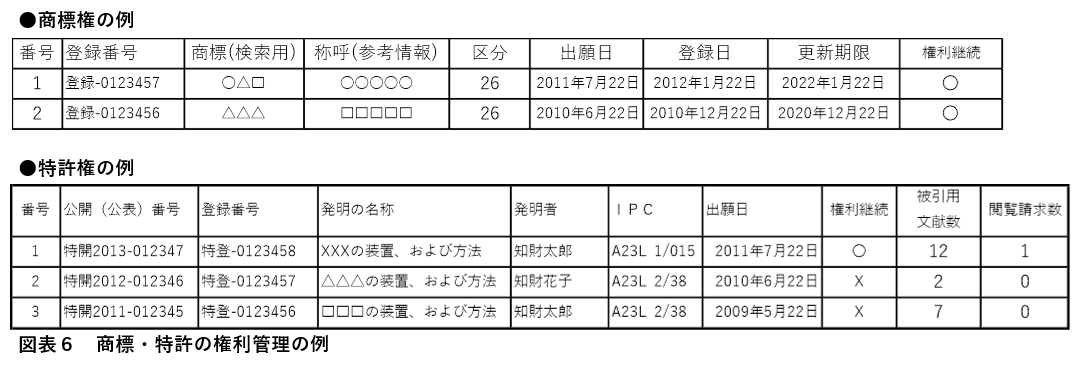 特許権についても同様であり、毎年の年金(維持費)の支払いを怠ると権利が失効するため、登録後の継続的な管理が必要となる。また、特許は登録後にもさまざまな情報が蓄積される。たとえば、図表6に示すように「被引用件数」や「閲覧請求」の有無などである。