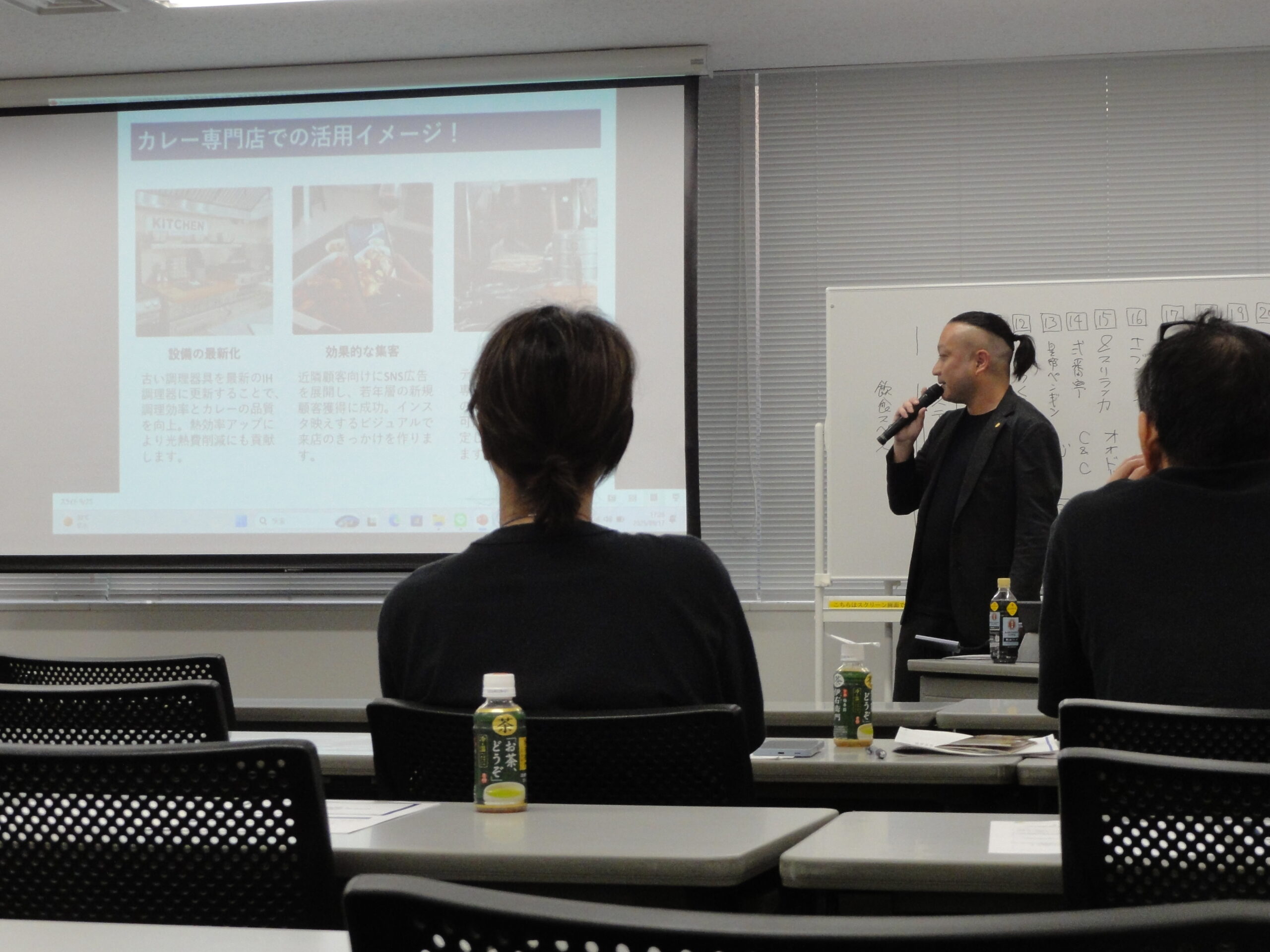 今回の「まちゼミ」は、2025年9月17日(水)に予選を通過した20店舗が集まる説明会の後に開催されました。「飲食店必聴!使える得する補助金制度」というテーマで、中央支部の伊窪拓真会員が講師を務めました。セミナーでは、国内カレー市場の動向や、カレー店の補助金活用事例など、専門店を意識した具体的な内容が紹介されました。参加者からは「補助金申請にはどのような準備が必要か」「個人事業主でも申請可能か」といった質問が寄せられ、島田満俊会員が自らの事務所で申請した補助金申請書をスクリーンに映しながら、実践的なポイントを解説する場面もありました。