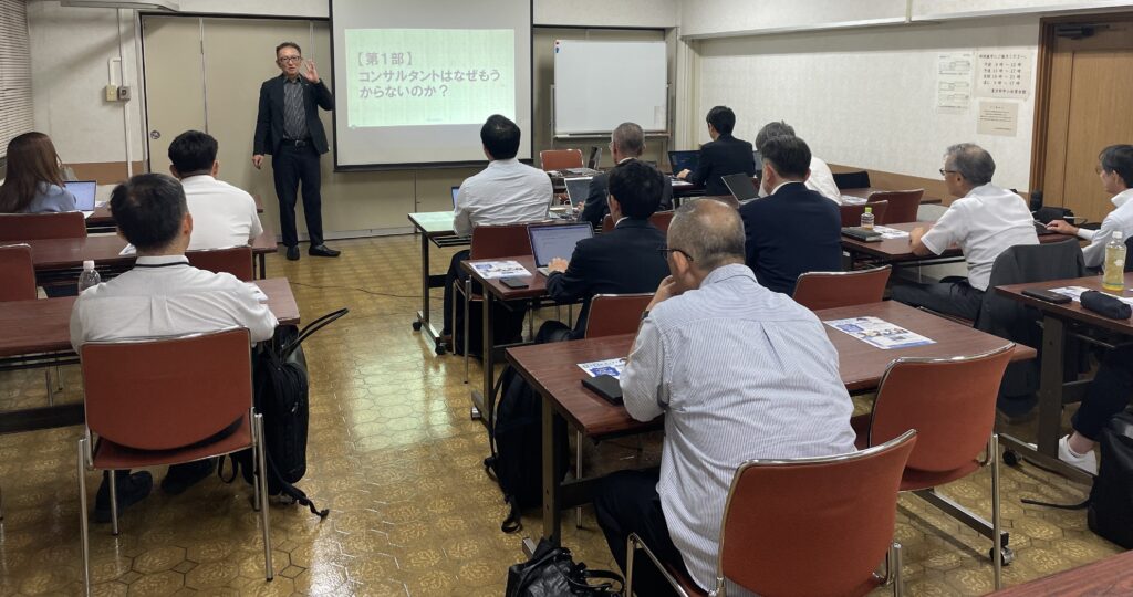 2025年9月24日(水)に開催した中央支部 能力開発推進部セミナーは、「儲かるコンサルタントになる3つの方法~週休三日で1000万円~」をテーマとして、佐藤公信氏(一般財団法人 経営者支援学会 代表理事)にご登壇いただきました。中小企業会館8FのA・B会議室は15名、オンライン参加者は100名以上を数え、とてもキャッチーなテーマへの関心の高さが伺えました。