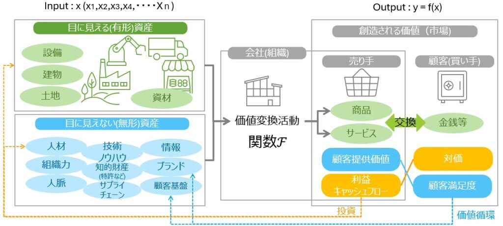 事業(ビジネス)の本質は、価値と対価の交換であるとすると、事業活動は価値創造することということになる。そうすると事業活動を行う器である会社(組織)は、さまざまなインプットを価値に変換する仕組みであり、インプットをx 、アウトプットである価値をy とすれば、会社(組織)を一種の関数f と考えて、y = f (x) という関数が成り立っていると考えられる。