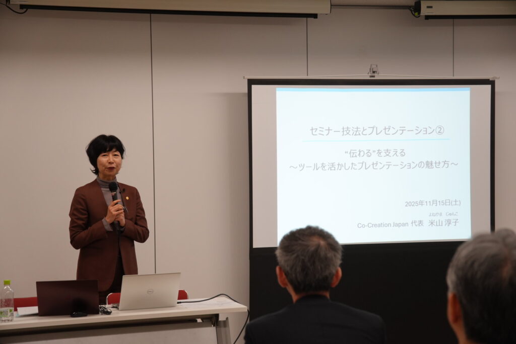 午後の最初の講義は、米山会員による「セミナー技法とプレゼンテーション②」です。模擬講演で作成しているレッスンプラン・レジュメ・スライドの位置づけと役割、「見やすい・伝わる・印象に残る」スライドの作り方、ツールを活かした効果的な伝え方についてご説明いただきました。