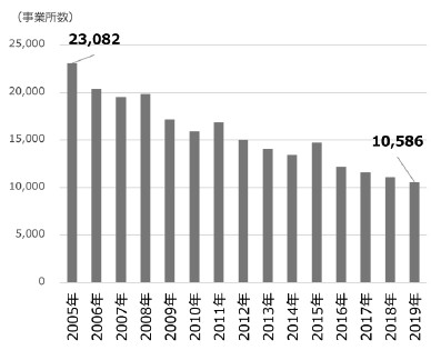 さらに供給面では、図表Ⅱの通り、国内の繊維工業事業所数が半減するなど製造事業者が著しく減少。取引先製造事業者の高齢化と共に、技術伝承の不足や機械の老朽化もあり廃業が増加中。結果、製品の品質不安定化や納期遅延を引き起こしており、事業継続における構造的なリスクとなっている。