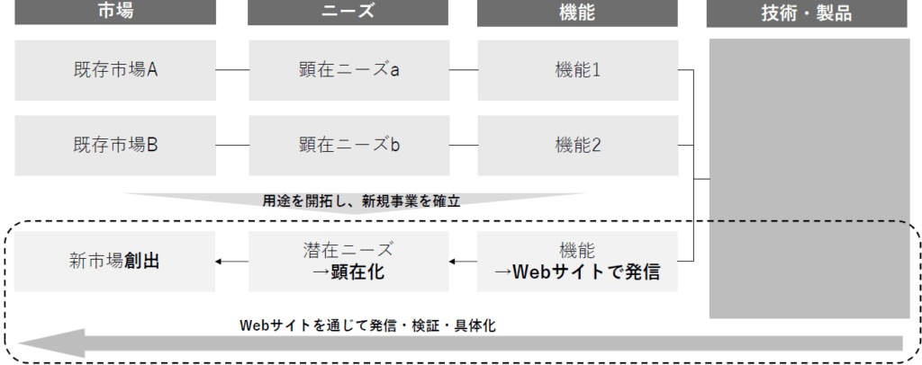 以上をふまえ当研究会では、A社の事業継続を目的とする場合に必要な“経営装置は、「新たな価値創造と持続的成長を目的とする市場開拓」であると判断した。そのため、Webマーケティングを単なる販売促進ではなく、「顧客との新たな対話を生むプラットフォーム」と定義し、A社の強みである幅広い商材と協力工場とのネットワークを武器に、既存製品を新規顧客へ展開する事業領域拡大を提案した(図表Ⅲ、Ⅳご参照)。