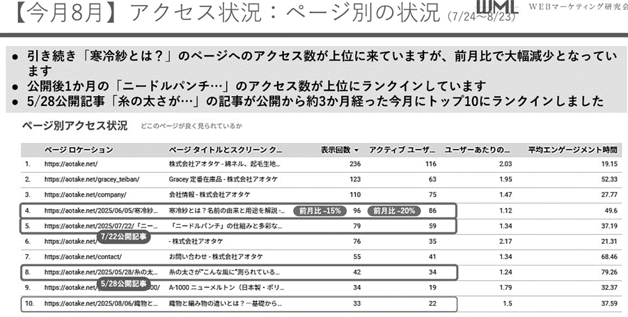 当初ブログ作成にためらいを見せていた社長に対し、E-E-A-Tの重要性を説きつつも、実践のハードルを下げるアプローチを提案した。その後実際にお客様から問い合わせがあった内容について解説を行った記事がブレークスルーとなった。2025年6月公開の「寒冷紗とは?」の記事へのアクセスが急増し、同月の総ユーザー数は前月比41.8%増の388人を記録した(図表V参照)。