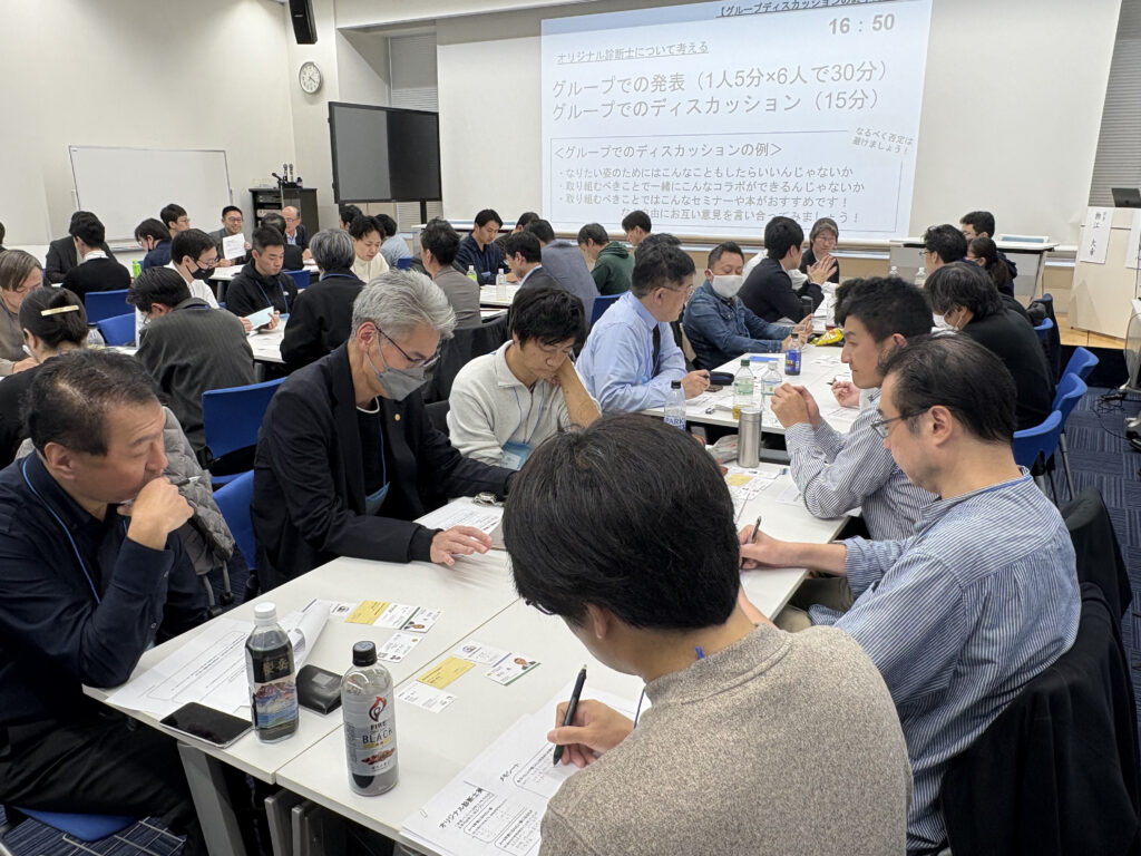 続くグループディスカッションでは先輩の講演を踏まえ、「3~5年度になりたい姿」「その為に1年以内に取り組むべきこと」を書き出し“オリジナル診断士実現シート”を作成しました。シートをもとに交流セッションでのグループ分けのままディスカッションを行い、フィードバックを行いながら相互に気づきを与え合う、非常に熱い議論が繰り広げられました。初対面の方々が多い状況にもかかわらず、2段階に分けたディスカッションも相乗効果となり、熱気あふれる45分となりました。