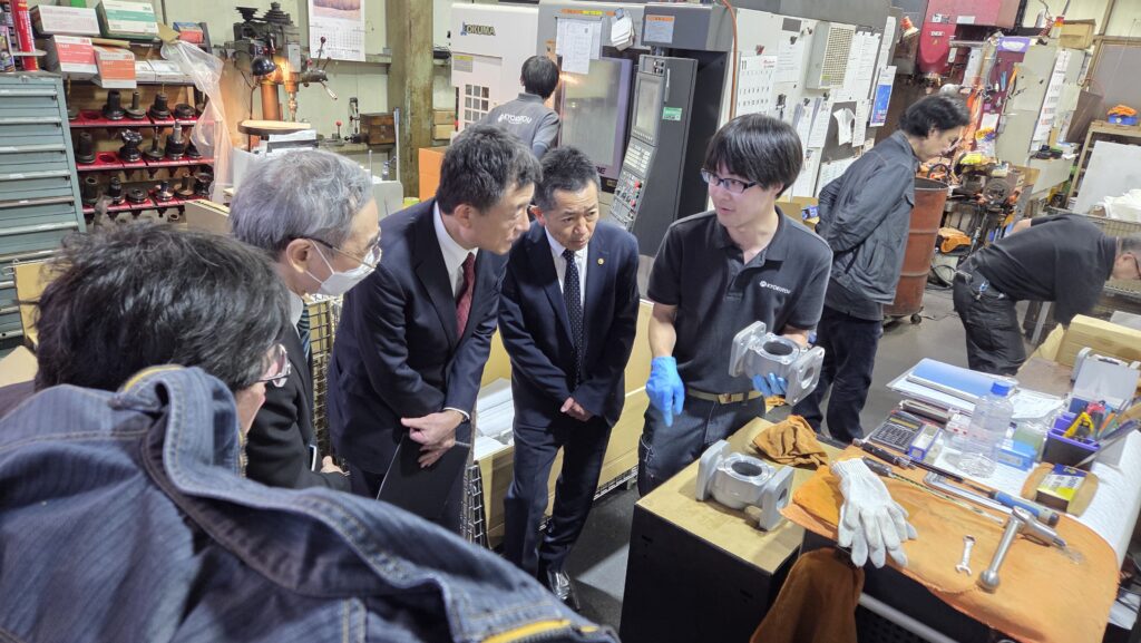 小泉会員より、工場で見学する製造装置について説明いただきました。手動で加工する汎用装置からコンピュータ数値制御(CNC)による自動装置に至るまでの製造装置の進化の流れと、装置進化に伴う作業工程効率化の具体例を学びました。さらに最近の本支援先への支援状況を学び、本支援先がさらに発展している様子がわかりました。