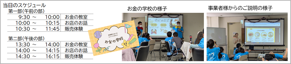 今回も、販売体験に加えてお金の教室、商品を提供頂いた事業者からの説明を加えたことで商売を身近に感じながらお金の重要性や、モノを売る事の難しさ、感謝の気持ちの大切さを学ぶ機会を提供出来たと思います。